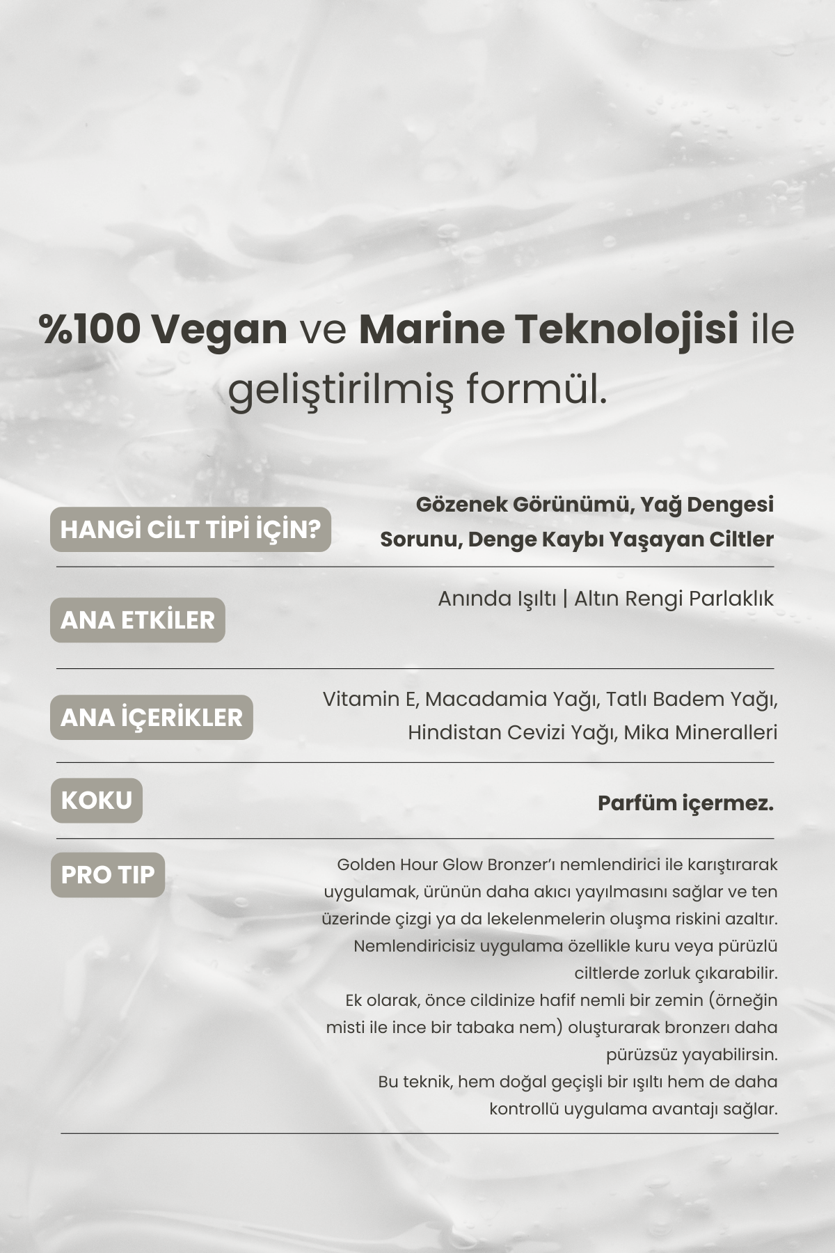 Tüm cilt tonlarına uyum sağlayan, aydınlatıcı ve nemlendirici etkili hafif ışıltılı vücut yağı. Cilde doğal ve ışıltılı bir bronzluk kazandırmak için geliştirilen bu yapılandırılabilir formül, Macadamia yağı ve E vitamini ile cildi beslerken, ışığı yansıtan Mica mineralleri sayesinde altın saat etkisi yaratır. Ciltte pürüzsüz, sağlıklı ve canlı bir görünüm sunar. Güneş sonrası kullanımda ya da özel anlar öncesinde parlak bir dokunuş için idealdir.
