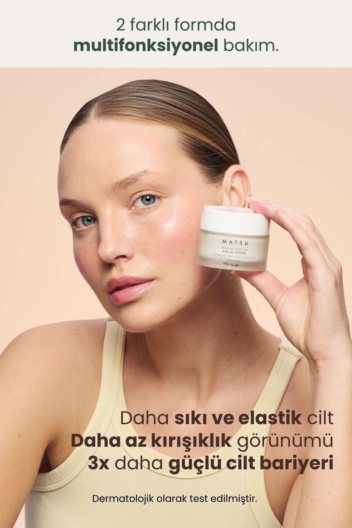 Marine Algae temizleme jeli, derinlemesine temizlik sağlarken cildin doğal nem dengesini korur. Peptit Krem ise Seramid, Amino Asit, Centella Asit, Niacinamide ve 8 farklı molekül boyutundaki Hyaluronik Asit gibi özel içeriklerle ile cildinizi yeniler, sıkılaştırır ve dolgunlaştırır.