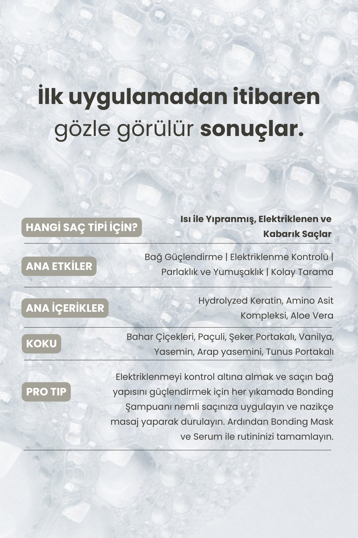 • "En iyi sonuç için evet. Bu şampuan, saç tellerine bağ onarımı sağlarken maksimum etki için Bonding serisinin bakım maskesi ve durulanmayan serum ürünleriyle birlikte kullanılmalıdır. Ekstra yumuşaklık ve kalıcı onarım için duş sonrası Creamask ile kombinleyebilirsiniz.