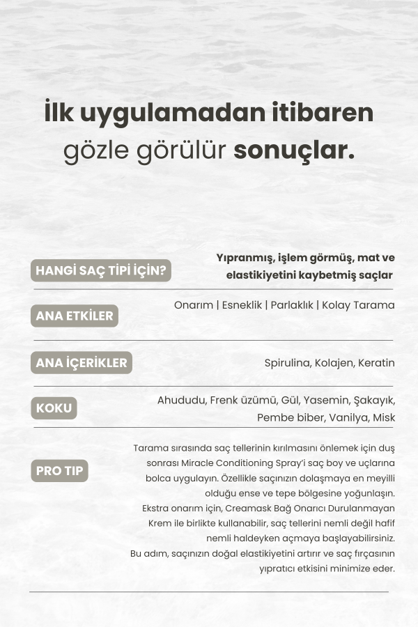 • Bu sprey, yıpranmış ve kırılgan saçları onarmak, nem dengesini sağlamak ve taramayı kolaylaştırmak için geliştirilmiştir. İçeriğindeki Biotin, Kolajen, Spirulina ve Keratin saç tellerini besler, güçlendirir ve elektriklenmeyi azaltır. Düzenli kullanımda saçın daha sağlıklı, pürüzsüz ve parlak görünmesine yardımcı olur.