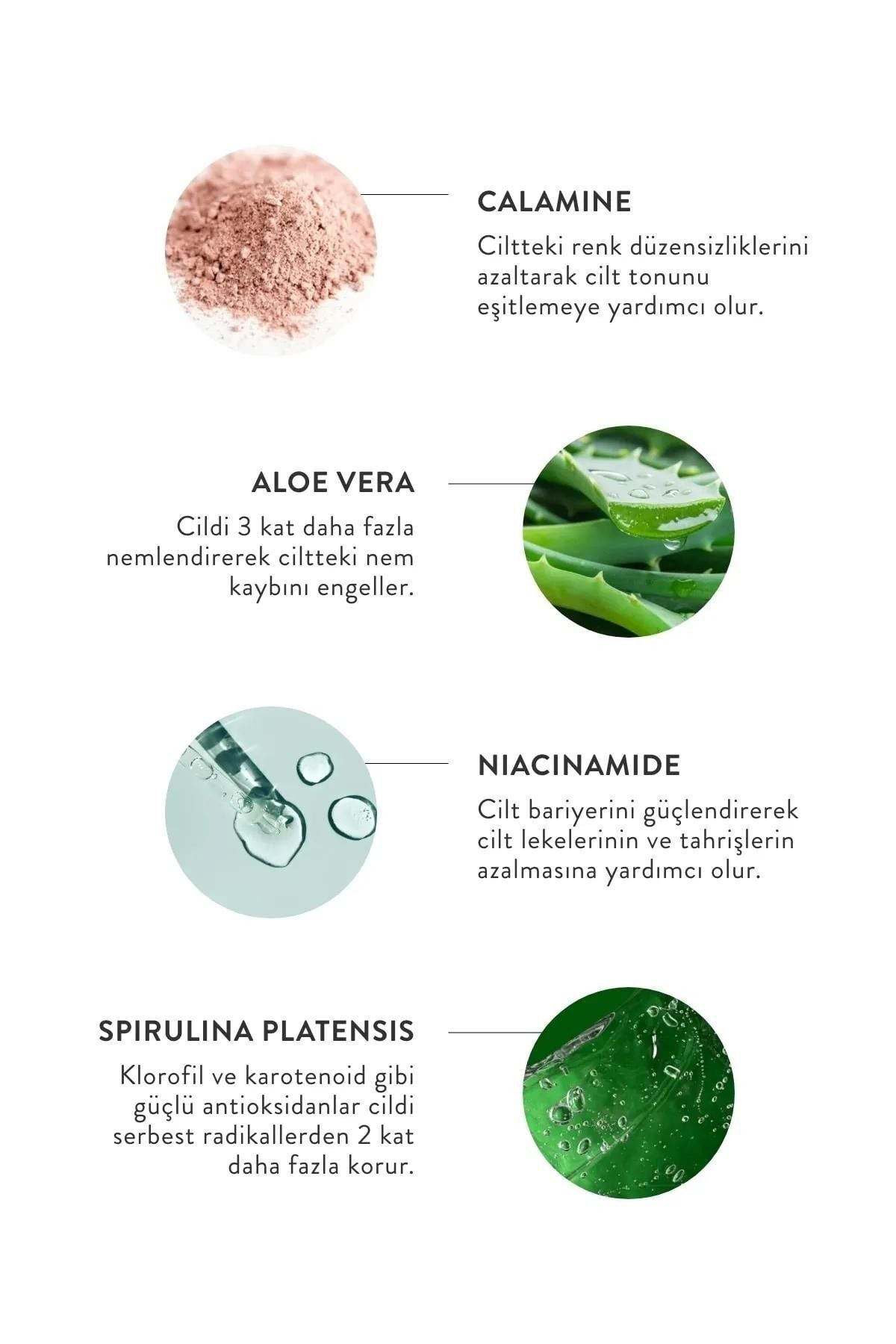 SPF 50 geniş korumalı güneş kremi, içeriğindeki Niacinamide, Hyaluronic Acid ve Spirulina sayesinde cilt parlaklığını artırır ve nemlendirir. Klinik onaylı formül, cildi UVA ve UVB ışınlarından koruyarak güneşe karşı geniş spektrumlu bir savunma sunar.