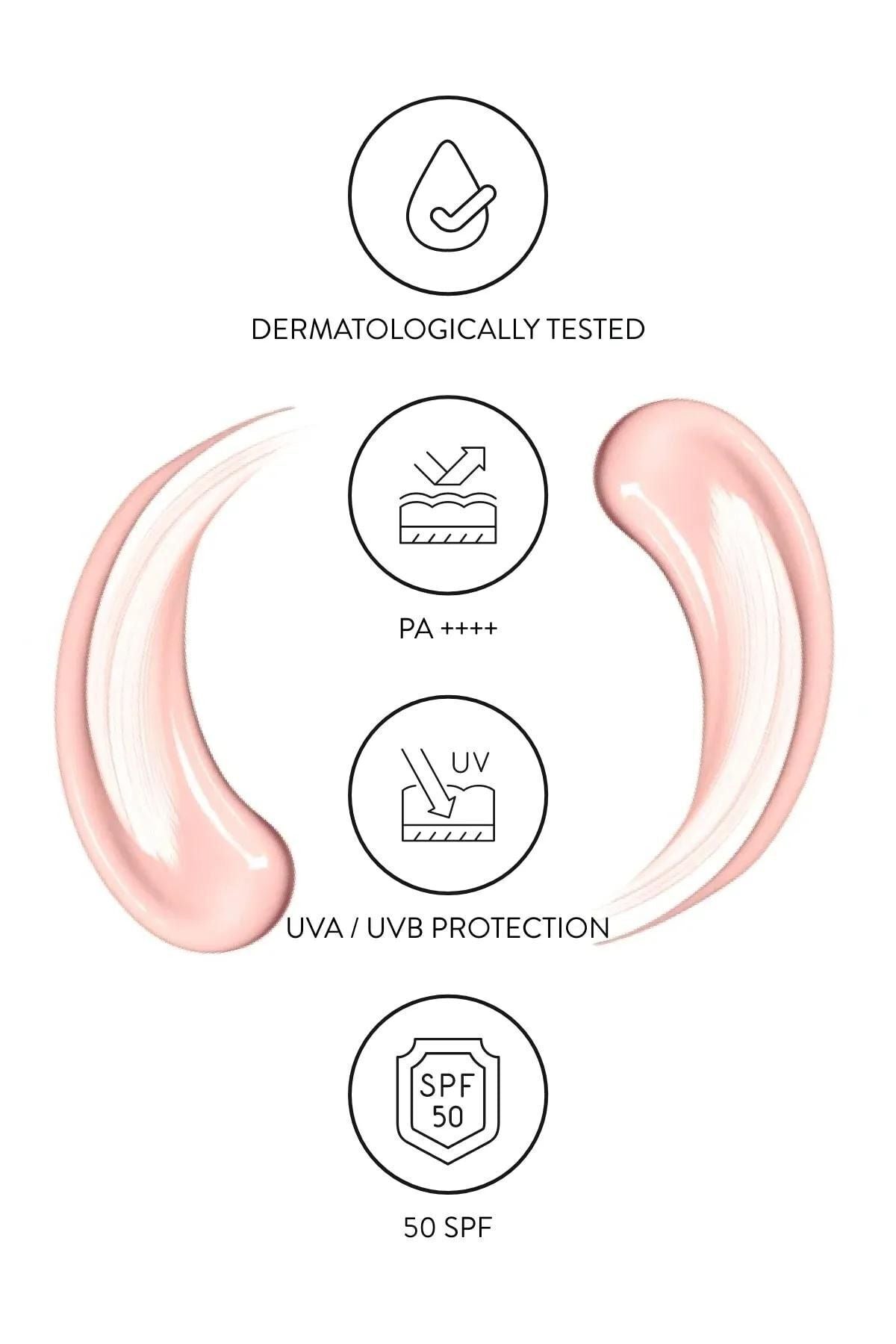 SPF 50 içeren renkli güneş kremi, hafif-orta ölçekte uygulanarak gözenekleri tıkamadan parlaklık, nemlendirme ve mükemmel bir bitiş sağlar.